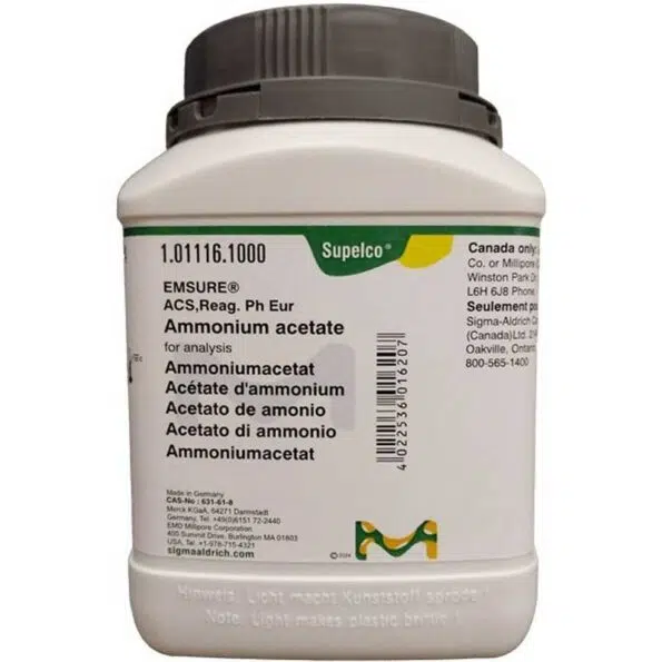 آمونیوم استات (Ammonium Acetate) یک نمک مهم در شیمی آلی و معدنی است که بهصورت پودر سفید و بسیار محلول در آب عرضه میشود. این ماده به دلیل رفتار بافری و توانایی تأمین یونهای استات و آمونیوم، در واکنشهای شیمیایی و فرایندهای آزمایشگاهی کاربرد فراوانی دارد.