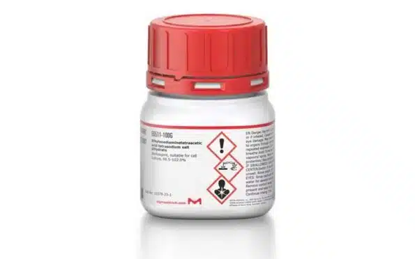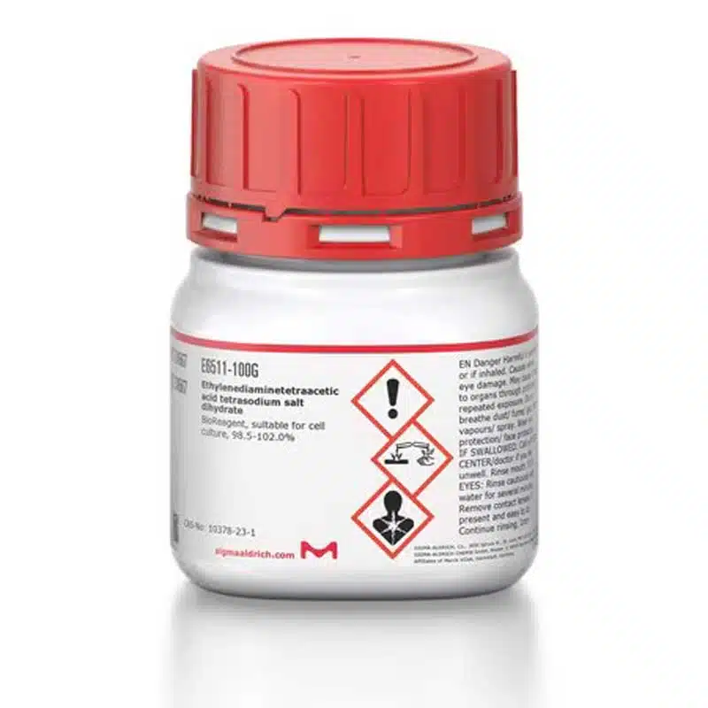 اتیلن دی آمین تترا استیک اسید تترا سدیم سالت دی هیدرات (Ethylenediaminetetraacetic acid tetrasodium salt dihydrate) با کد E6511 محصول اصلی و اورجینال شرکت Sigma-Aldrich، یکی از پرکاربردترین ترکیبات شیمیایی در آزمایشگاههای تحقیقاتی و صنعتی است. این ماده با فرمول شیمیایی C₁₀H₁₂N₂Na₄O₈ · 2H₂O به صورت پودر سفید رنگ و با خلوص بالا عرضه میشود و قابلیت انحلال عالی در آب را دارد. این محصول دارای بستهبندی استاندارد سیگما و برگه آنالیز (COA) بوده و کیفیت و اصالت آن تضمین شده است.