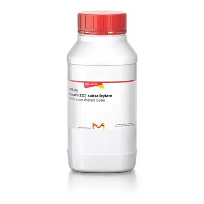 بیسموت (III) ساب سالیسیلات با فرمول تقریبی BiC₇H₅O₄ و کد 480789، ترکیبی آلی-معدنی با خلوص فوقالعاده بالا (≥99.9% پایه فلزات کمیاب) است که توسط برند معتبر Sigma-Aldrich ارائه میشود. این ماده بهصورت پودری سفید رنگ عرضه شده و به دلیل ویژگیهای ساختاری خاص خود، کاربردهای متعددی در علوم دارویی، بیوشیمی، شیمی معدنی و تحقیقات ضدباکتری دارد.