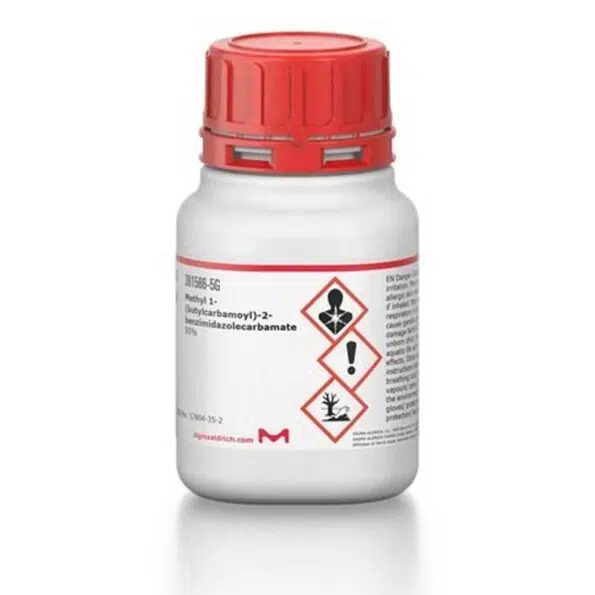 متیل 1-(کاربامویل)-2-بنزیمیدازولکاربامات که بیشتر با نام تجاری بنومیل (Benomyl) شناخته میشود، یک قارچکش سیستمیک بنزیمیدازولی است که با خلوص ≥95% و به صورت پودر جامد سفید از برند معتبر Sigma-Aldrich (کد 381586) ارائه میشود. این ترکیب به دلیل ساختار پایدار، فعالیت بالا در برابر طیف وسیعی از قارچهای گیاهی، و همچنین استفاده در تستهای آنالیتیکی محیطی، کاربردهای فراوانی در کشاورزی، محیط زیست و آزمایشگاههای تخصصی دارد.