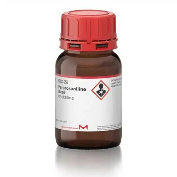 پاراروزانیلین (Pararosaniline Base) با کد P7632 از برند معتبر Sigma-Aldrich یک رنگ تریفنیلمتانی پرکاربرد در علوم زیستی و شیمی تجزیه است. این ماده بهصورت پودر بنفش یا صورتی عرضه میشود و بهطور گسترده در رنگآمیزی میکروسکوپی، بهویژه در رنگآمیزی گرم (Gram staining) برای شناسایی باکتریها، مورد استفاده قرار میگیرد.