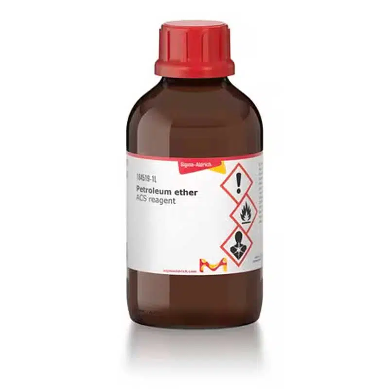 پترولیوم اتر (Petroleum ether) کد 184519 سیگما یک حلال هیدروکربنی با کیفیت ACS و سطح کیفیت 200 است که از مخلوط هیدروکربنهای آلیفاتیک سبک (عمدتاً پنتان و هگزان) تشکیل شده است. این ماده به دلیل داشتن نقطه جوش پایین (۳۰–۶۰ درجه سانتیگراد) و فراریت بالا، یکی از حلالهای پرکاربرد در آزمایشگاههای شیمی، بیوشیمی و صنایع تحقیقاتی به شمار میآید.